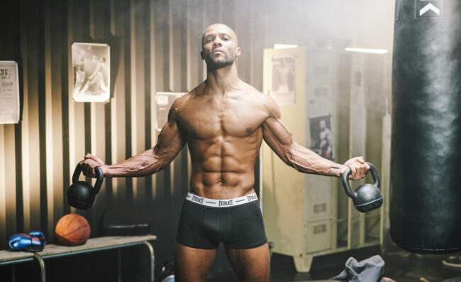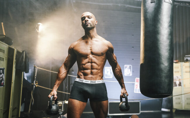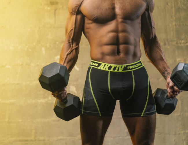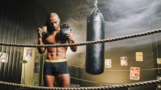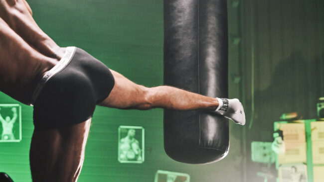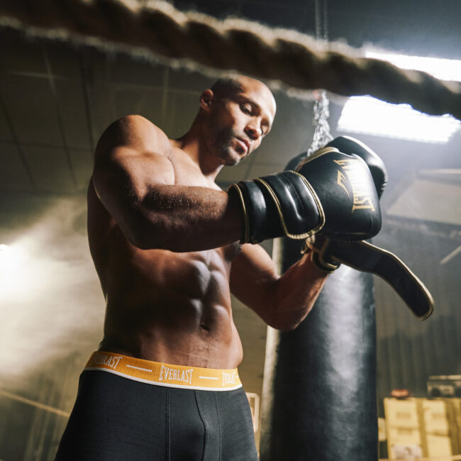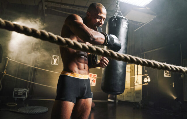 Pour le groupe Textiss, nous avons réalisé une série de photos d’ambiance pour des boxers dédiés à la pratique sportive. Nous avons recréé une salle de sport/boxe dans nos studios.